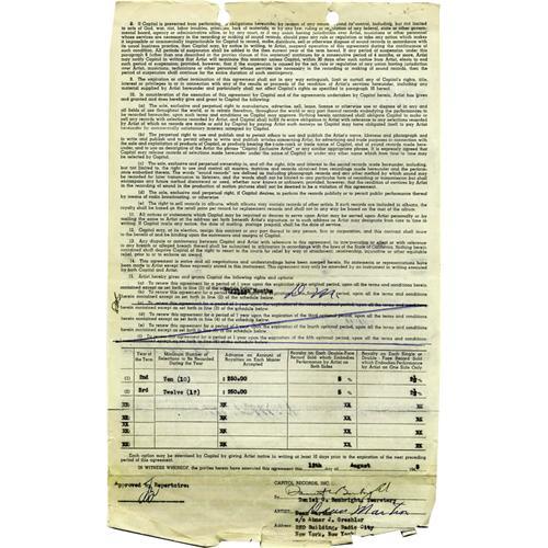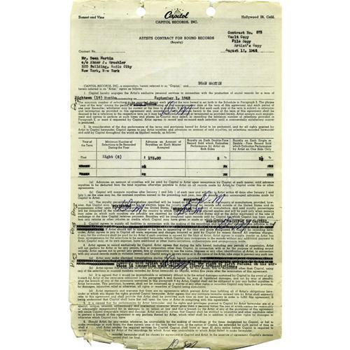 <B>Dean Martin's First Recording Contract with Capitol Records, Signed (1948).</B></I> Excellent signed document, one page both sides, 8.5" x 13", Capitol Records Inc. letterhead, August 12, 1948. A significant document in Martin's legendary career, presented here is Dean Martin's first Artist Contract with Capitol in which Martin agrees to record a minimum of eight tracks for Capitol, receiving an advance of $175 per recording and a royalty of 5% for every double-face record sold (2.5% for every single sold). Also included in the agreement is an option (that was obviously excercised) allowing Capitol to retain Martin's services again for a second and third year if they so desired. Initialed by Martin throughout the body of the document a total of eight (8) times and signed in blue ink in full, "Dean Martin," at the conclusion. Document exhibits moderate signs of wear along the top and bottom edges, with a small tear affecting the "M" in Martin's full signature. However, the text of the document is unaffected and remains fully intact. Given the prominence of the document, this item is a "must have" for the ultimate Dean Martin collector! <I>With COA from PSA/DNA.</B></I>