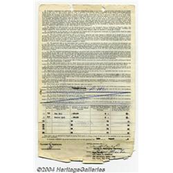 Dean Martin's First Recording Contract with Capitol Records, Signed (1948). Excellent signed document, one page both sides, 8.5 x 13, Capitol Records Inc. letterhead, August 12, 1948. A significant document in Martin's legendary career, presented here is Dean Martin's first Artist Contract with Capitol in which Martin agrees to record a minimum of eight tracks for Capitol, receiving an advance of $175 per recording and a royalty of 5% for every double-face record sold (2.5% for every single sold). Also included in the agreement is an option (that was obviously excercised) allowing Capitol to retain Martin's services again for a second and third year if they so desired. Initialed by Martin throughout the body of the document a total of eight (8) times and signed in blue ink in full, "Dean Martin," at the conclusion. Document exhibits moderate signs of wear along the top and bottom edges, with a small tear affecting the "M" in Martin's full signature. However, the text of the document is unaffected and remains fully intact. Given the prominence of the document, this item is a "must have" for the ultimate Dean Martin collector! Important notice: Heritage usually auctions material at the rate of 200-250 lots per hour. On some occasions eBay Live bid software or the Internet may not be able to keep up with the pace of the auction. We recommend placing a realistic absentee bid now as insurance to avoid disappointment. Occasionally the auctioneer may eliminate or reject an eBay Live bid, and the auctioneer may also reopen a lot after the close of the eBay live bidding (usually because we missed an audience bid), and may reject your bid even if it shows you as the winning bidder. By bidding via eBay Live, you agree that Heritage may award the lot to another bidder at its sole discretion under the circumstances described above or any other reasonable circumstances. Since eBay bids are not shown to us until we open the lot on the floor, we treat those bids just like floor bids. In most cases the floor responds before the eBay bid is presented to us, due to Internet lag time, so for consistency we have made it a policy that floor bids are always considered first over tie eBay live bids. Also please note that all Heritage lots purchased through eBay Live carry a 20% Buyer's Premium. Please make sure you read the Terms and Conditions before you bid.