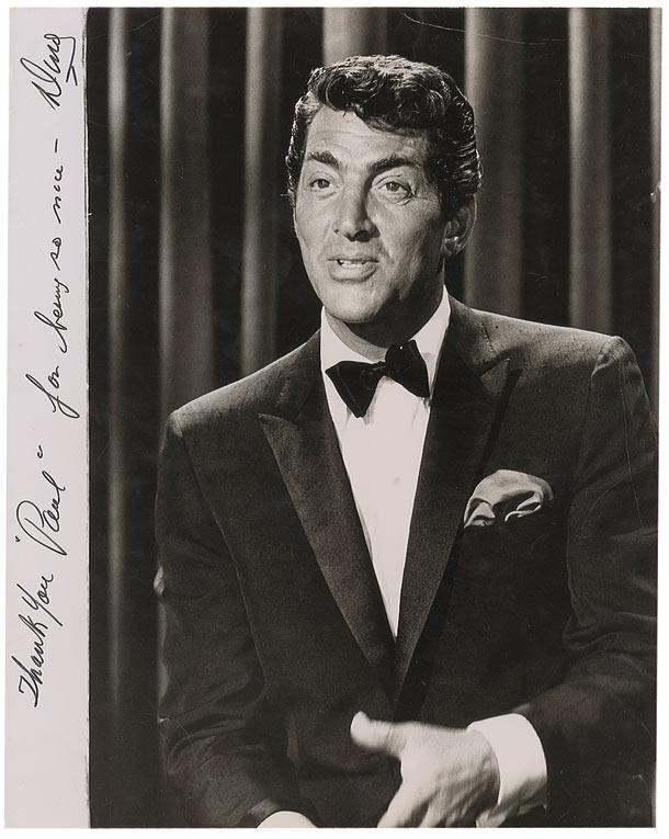 Glossy 11 x 14 photo of the tuxedo-clad Martin, signed and inscribed vertically in the left border in black felt tip “Thank you ‘Paul’ for being so nice-Dino.” In very good condition, with scattered creases, surface marks, and dings.