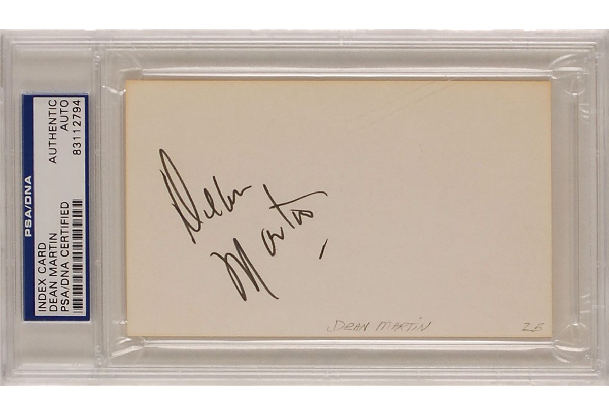 Felt tip signature, “Dean Martin,” on an off-white 5 x 3 card with a collector’s notation to the lower border. Encapsulated in a plastic PSA/DNA authentication holder. In fine condition, with light toning to edges.