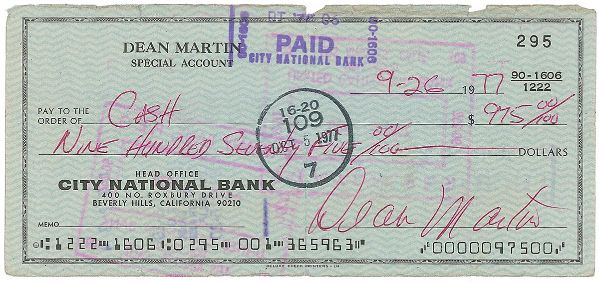 Personal check, 6 x 2.75, filled out and signed by Martin, payable to cash for $975, September 26, 1977. A central vertical fold, expected bank stamps, a few tiny tears and slight paper loss to top edge, and general overall handling wear, otherwise fine condition.