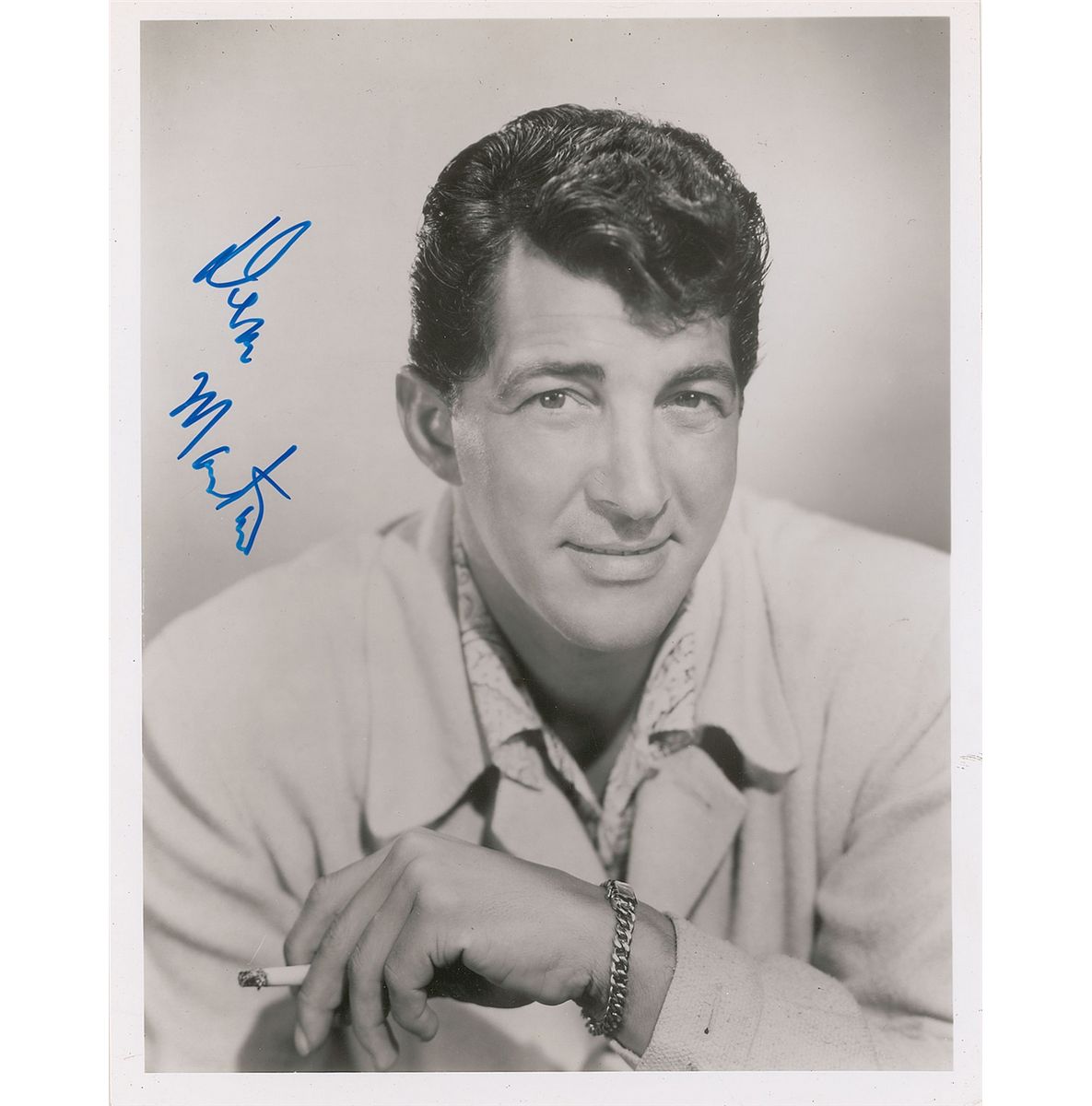 Glossy 8 x 10 photo of Martin holding a cigarette, signed in blue felt tip. In fine condition, with some creases to horizontal edges.