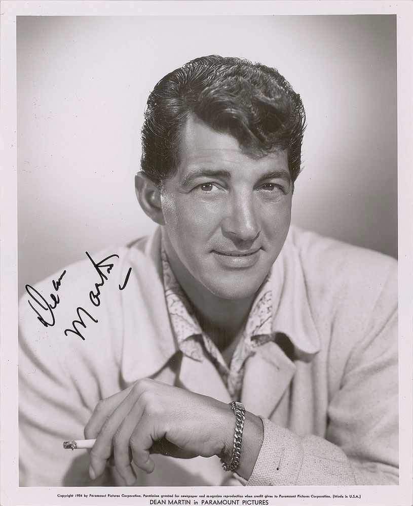 Glossy 8 x 10 Paramount Pictures publicity photo of Martin coolly holding a cigarette, signed in black felt tip. Reverse bears a Wisdom Magazine stamp and a Paramount/Bud Fraker stamp. In fine condition. From the Harvey and Rhoda Kuflik Collection.