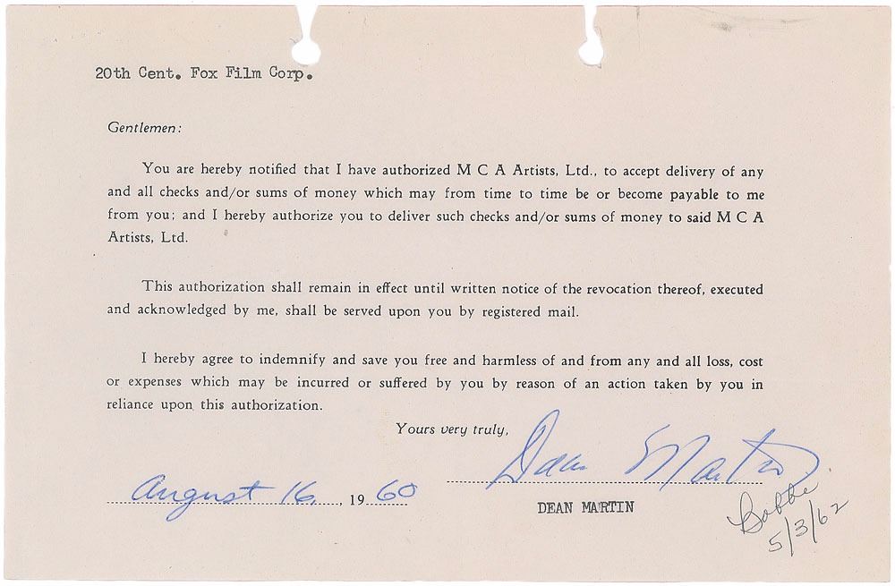 DS, one page, 8.5 x 5.5, August 16, 1960. Official letter addressed to the 20th Century Fox Film Corporation, in part: "You are hereby notified that I have authorized MCA Artists, Ltd., to accept delivery of any and all checks and/or sums of money which may from time to time be or become payable to me from you; and I hereby authorize you to deliver such checks and/or sums of money to said MCA Artists, Ltd." Signed and dated at the conclusion in blue ballpoint by Martin. In fine condition, with scattered light creasing and two vertical folds.