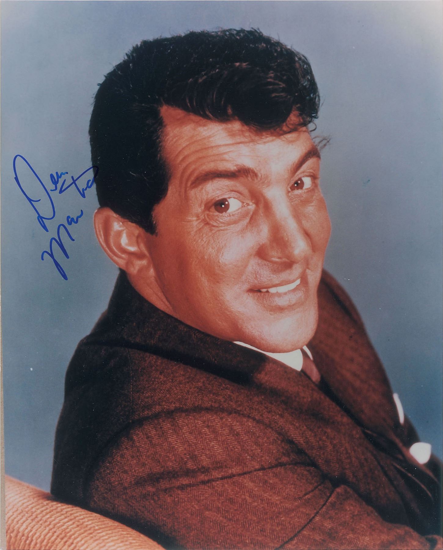 Color glossy 8 x 10 close-up photo of the 'King of Cool' smiling over his shoulder, signed in blue felt tip by Dean Martin. In fine condition.