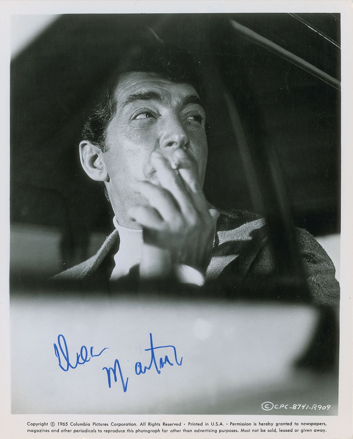 Glossy 8 x 10 Columbia Pictures publicity photo of Dean Martin as he appeared in the 1966 spy spoof The Silencers, signed in blue felt tip. In fine condition, with a couple of light vertical bends.
