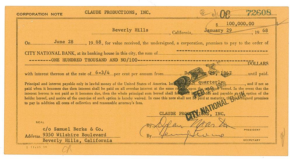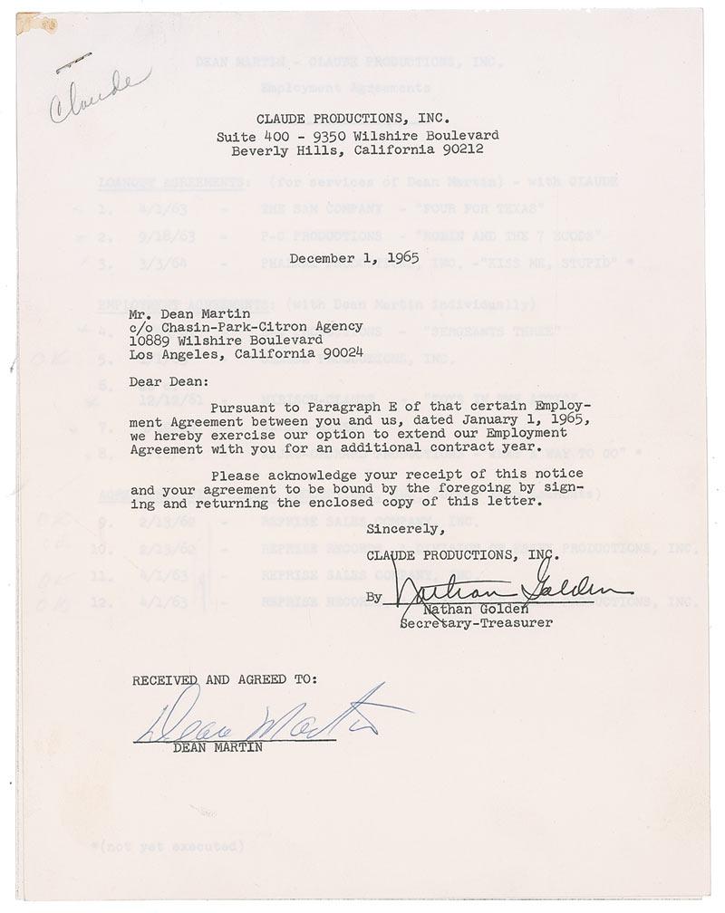 DS, two pages, 8.5 x 11, December 1, 1965. Agreement between Martin and Claude Productions, Inc., extending Martin’s employment for an additional year. Signed at the conclusion by Martin. Second page lists various agreements previously signed. In fine condition, with pencil notations to both pages, staple to top left, and a bit of soiling to one corner tip. Accompanied by a 1968 promissory note for $100,000, bearing two secretarial signatures.