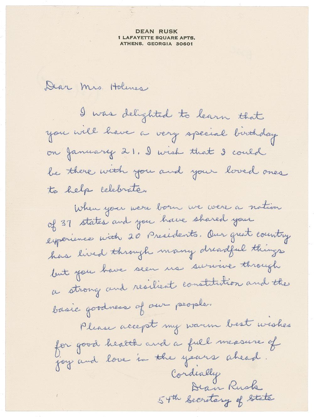 ALS signed “Dean Rusk, 54th Secretary of State,” one page, 5.75 x 7.75, personal letterhead, no date. Rusk writes Bessie Holmes in celebration of her birthday. In part: “When you were born we were a nation of 37 states and you have shared your experience with 20 Presidents. Our great country has lived through many dreadful things but you have seen us survive through a strong and resilient constitution and the basic goodness of our people,” In fine condition. Accompanied by the original mailing envelope, addressed by Rusk who has written his last name and return address at the upper left corner, postmarked December 3, 1975.