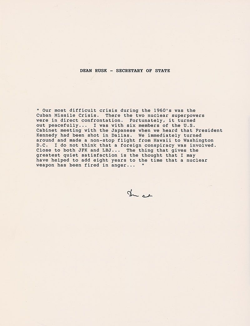 Secretary of State under Kennedy (1909–1994). Souvenir typescript of Rusk’s statement on the Cuban Missile Crisis, one page, 8.5 x 11, signed at the conclusion in black ballpoint. In part: “Our most difficult crisis during the 1960s was the Cuban Missile Crisis. There the two nuclear superpowers were in direct confrontation…I was with six members of the US Cabinet meeting with the Japanese when we heard that President Kennedy had been shot in Dallas. We immediately turned around and made a non-stop flight from Hawaii to Washington DC. I do not think that a foreign conspiracy was involved.” In fine condition.