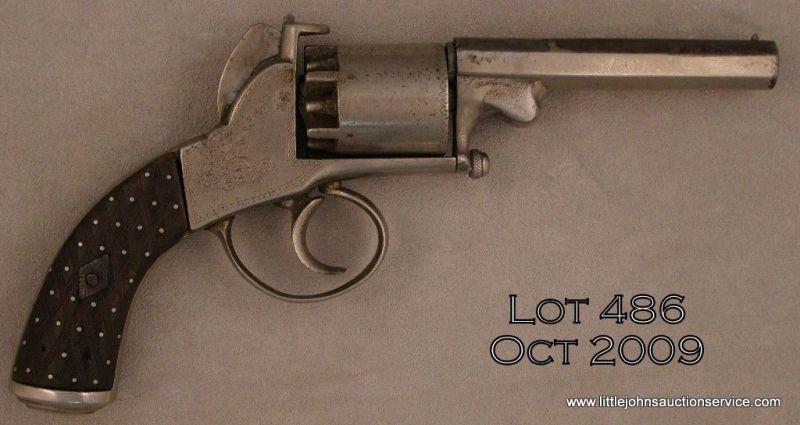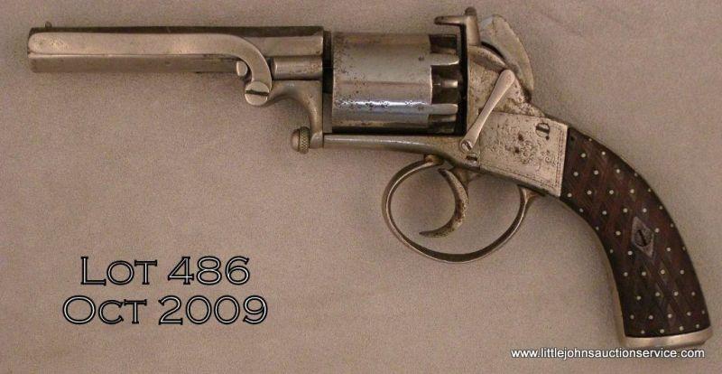 Deane style English double action percussion revolver 38 cal., 6 shot, nickle plated, side rammer, fancy grips with German silver studs or pins. 10 1/2" overall, 4 1/4" barrel, D.A. only with spring type hammer block. No name ormarkings other than British proofs. Shows old nickel finish of which 80% remains with some pitting and erosion. Grips are good. The pistol shows light scroll engraving. Just the type imported in the Civil War Era Hyde and GoodrichNew Orleans and other agents who purchased fine quality European Arms. Est. $350 - $700