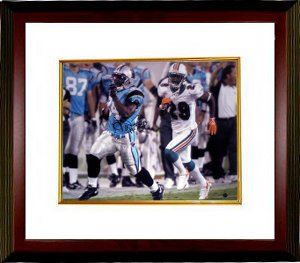 On April 29, 2006, Deangelo Williams was selected by the Carolina Panthers with the 27th overall pick in the NFL Draft. In 2008, Williams set a franchise record for rushing touchdowns in one game by scoring four touchdowns in a week 13 game against the Green Bay Packers. In week 15 of the 2008 season, Williams was selected FedEx Ground Player-of-the-Week after a dominating performance in which he rushed for 186 yards on 19 carries and 2 touchdowns vs. Tampa Bay Buccaneers on Monday Night Football. During the 2010 Pro Bowl, DeAngelo Williams scored a touchdown on a 7 yard run, the first by a Panthers player in team history. Deangelo Williams has hand autographed this Carolina Panthers 16X20 Photo. Custom White Mat and Premium Mahogany Frame as shown. Williams hologram and Certificate of Authenticity from Athlon Sports.