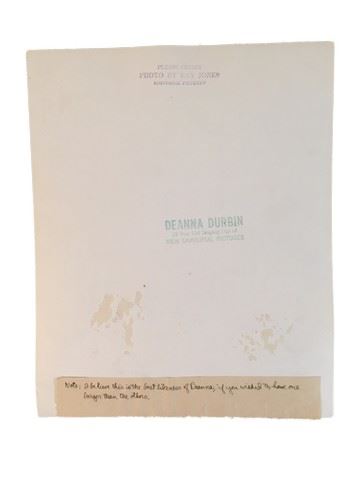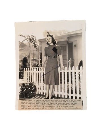 An 8.5" X 11" autographed portrait of Deanna Durbin. Paired with a piece of the original, wooden dance floor from Debbie Reynolds Dance Studio, with a custom engraved "Debbie Reynolds Dance Studio" plate (3.5"x 6.25"). This amazing memorabilia comes direct from the Debbie Reynold's archive collection.