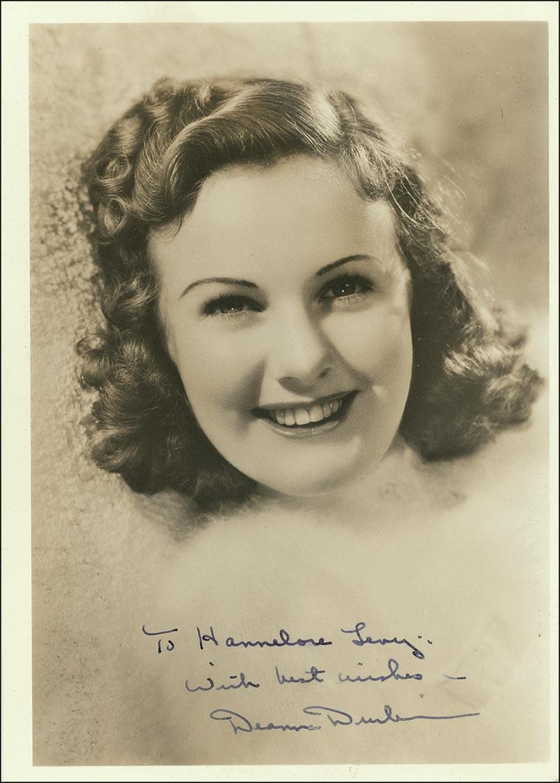 Vintage matte-finish 5 x 7 photo, signed and inscribed in purple fountain pen “To Hannelore Levy, With best wishes—Deanna Durbin.” In fine condition, with a trivial brush to inscription, and mounting and adhesive remnants on reverse. Pre-certified PSA/DNA and RRAuction COA.