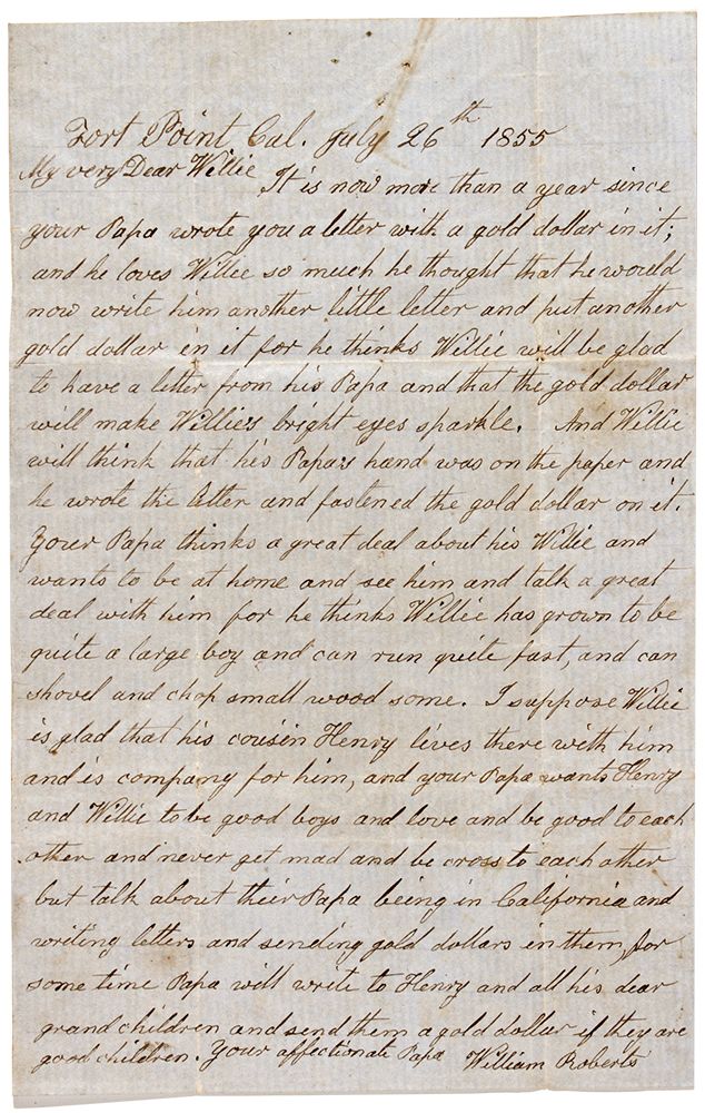 1855 Exquisitely handwritten letter from William Roberts, at Fort Point, California, July 26th, 1855, to his son Willie in S. Scituate, Rhode Island. Beautiful script, totally legible and sanguine in its lonely distance from his beloved son. It begins "It is now more than a year since your papa wrote you a letter with a gold dollar int it, and he loves Willie so much he thought that he would now write him another." Measures 5x7.5 inches, light blue paper. Unfortunately, the gold dollar is no longer attached. Historical. - HKA#66243