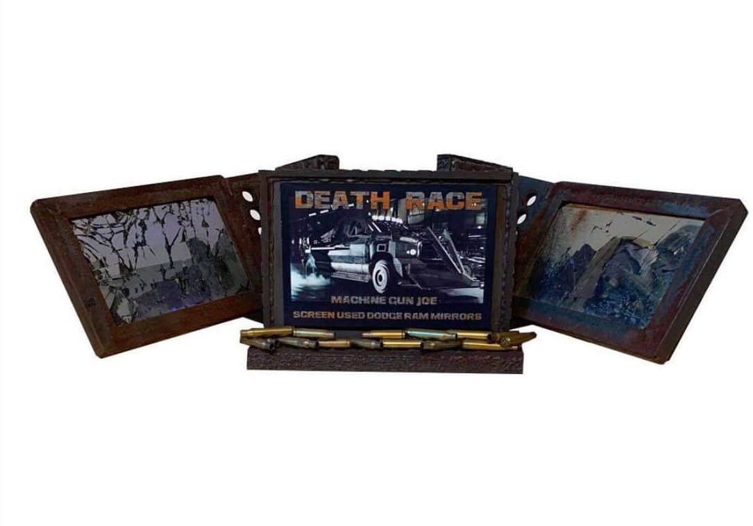 Set of mirrors used on the Dodge Ram driven by Machine Gun Joe, actor Jason Statham in the 2008 film Death Race. Ex-con Jensen Ames is forced by the warden of a notorious prison to compete in our post-industrial world's most popular sport: a car race in which inmates must brutalize and kill one another on the road to victory. This is a set of two very large and very heavy side view mirrors custom made for the car in the film. This set includes a display stand featuring the films title with bullet shell details. These pieces remain in excellent, production used condition.