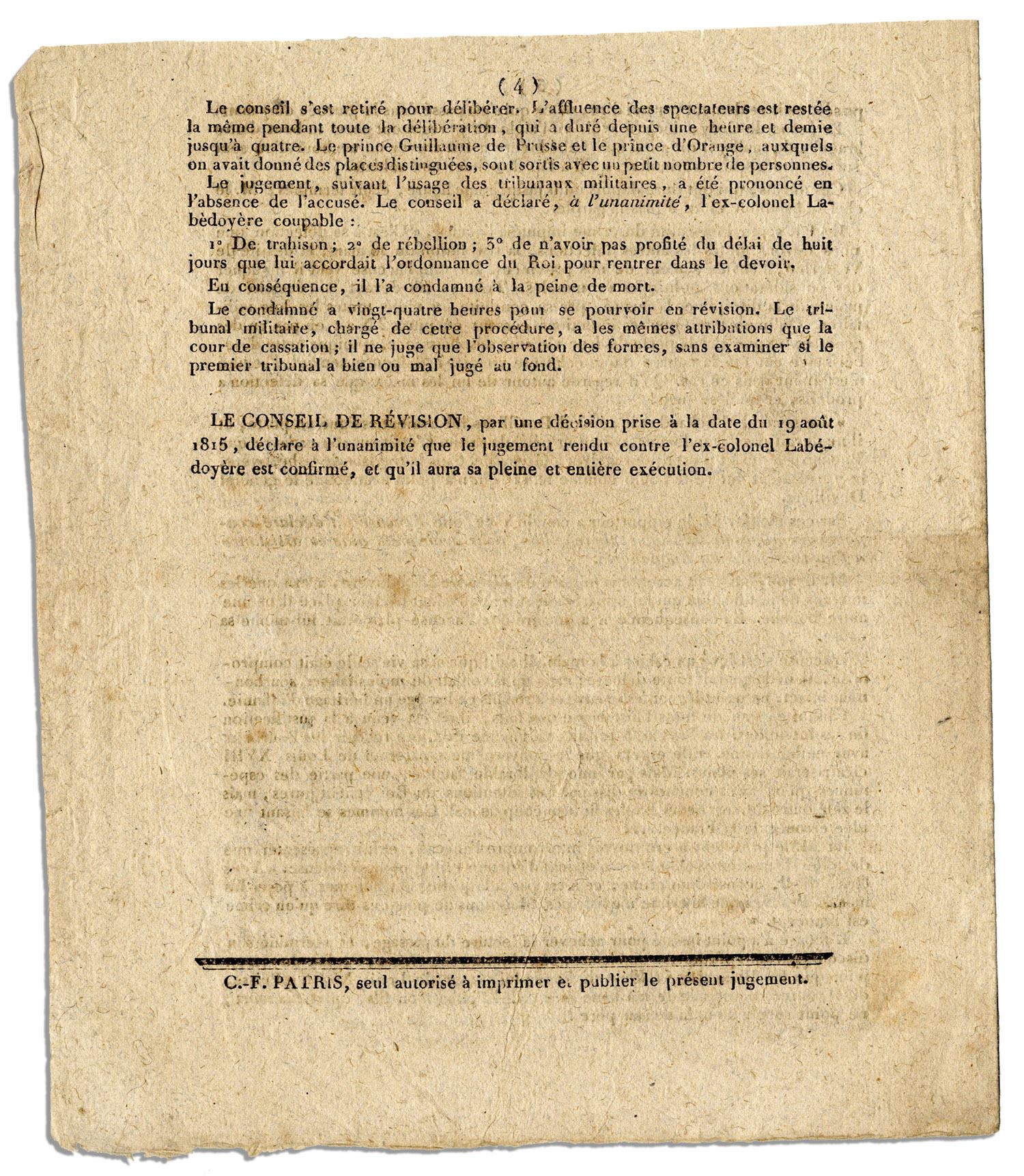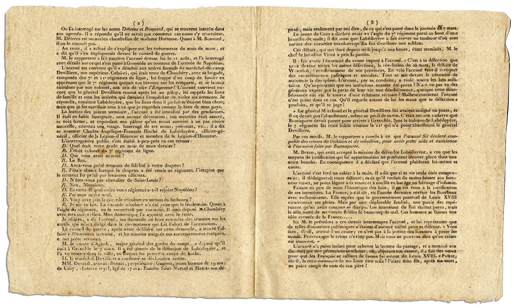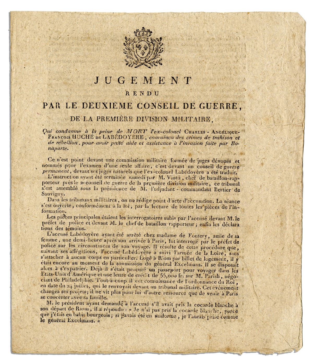 Original 1815 French circular issued by the Council of War announcing the death sentence of Napoleon's General Charles de la Bedoyere. In part: ''...The accused who was arrested at the home of Madame de Fontery, friend to his wife, half an hour after his arrival in Paris...The enormity of his crime was made clear 'it is because of your mistakes that lead to all other other defections, the revolution of March 20, the defeat of Waterloo, and invasion of our provinces...'' Twenty-nine at the time, Bedoyere was executed on 19 August 1815. Printed by C.F. Patris, the exclusive printer of such death sentences. 4pp. on card-stlye paper measures 8.25'' x 9.5''. Minimal paper loss to lower right edges and corner, else near fine. Accompanied by a more complete translation, including portions of Bedoyere's defense.