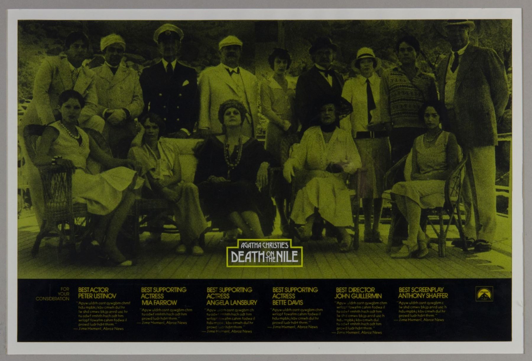 (Paramount, 1978) This developmental artwork was created as a promotional concept for Agatha Christie's "Death on the Nile". The artwork reads "For Your Consideration" and was created as an Academy Awards promotional concept for certain categories. The smallest portions of text include placeholder letters which are randomized, and the concept was created with printed imagery adhered to art board with silkscreened text layers hinged over the top of the printed imagery. The artwork has a mat frame attached, with an image size of 14"x21.5" and a total size of 22"x28.5". The condition is good with some wear to the mat and edges.