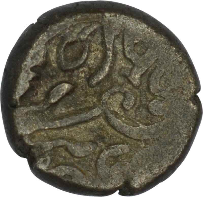 Maitrakas of Vallabhi, Bhatarka, De-Base Silver (Billon) Drachma, Obv: king profile bust facing right, Rev:trident with brahmi legend "rajino mahakshatrapasa paramaditya bhakta mahasamanta sharva bhattarakasya", 1.85g, 11.43mm, (Mitch # 4885-4887), about very fine.