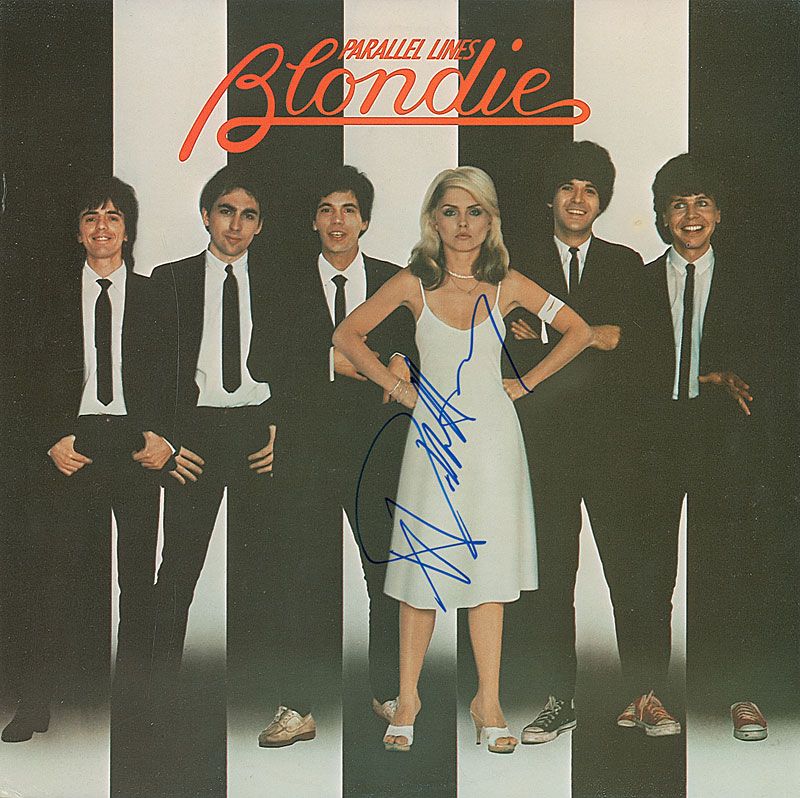 Blondie’s Parallel Lines album signed on the front cover in blue felt tip. In fine condition, with a mild album impression to front cover. The record is included.
