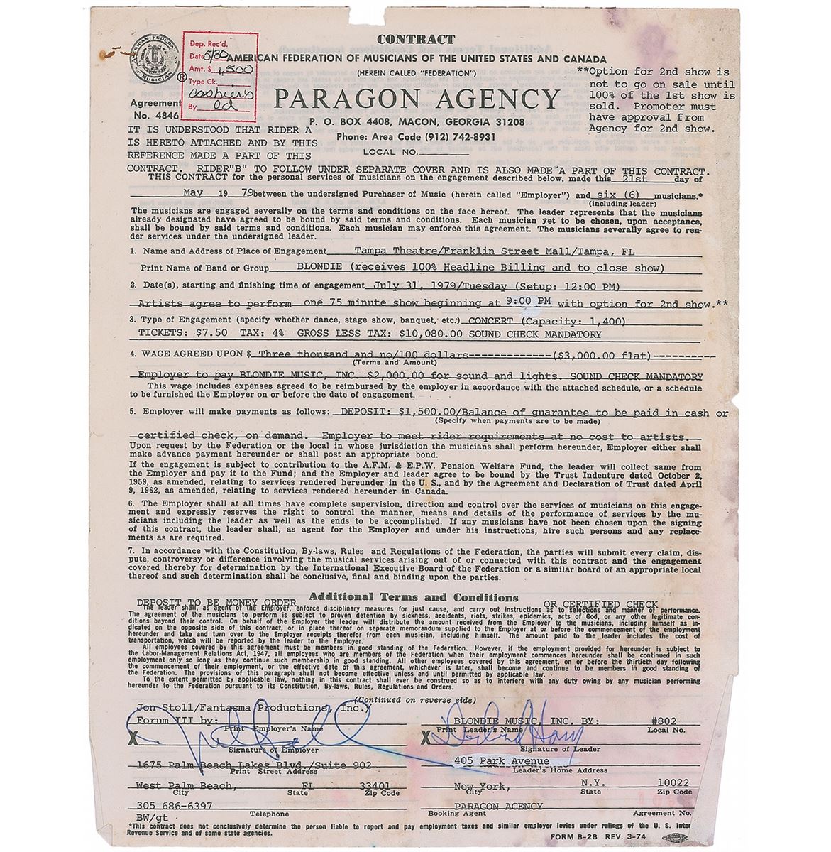 DS, one page, 8.5 x 11, May 21, 1979. Agreement between Blondie and Fantasma Productions, Inc., in which Harry agrees for the group to perform at the Tampa Theatre on July 31, 1979. Signed at the conclusion in blue ballpoint by Harry and countersigned by Jon Stoll. In very good condition, with areas of dampstaining affecting the signature area, scattered creases, soiling, a few small edge tears, and paper loss to top edge.