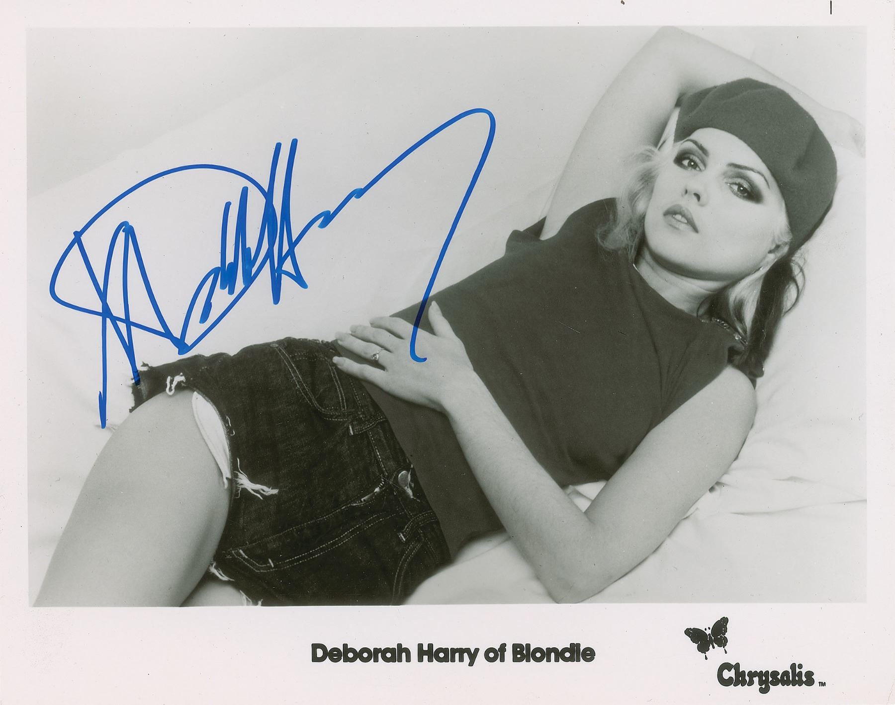 Glossy 10.25 x 8 Chrysalis Records promotional photo of the Blondie singer in a relaxed pose, signed in blue felt tip by Debbie Harry. In fine condition.