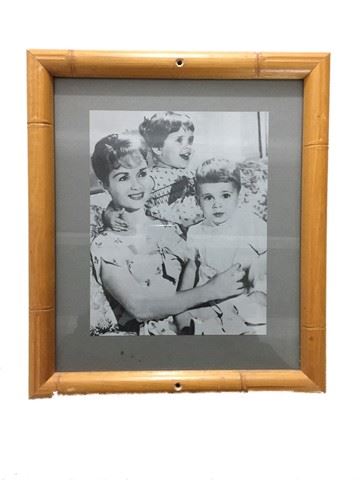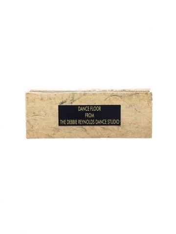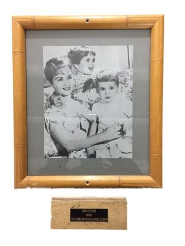 From Debbie Reynolds Dance Studio, this is a family photo of Debbie Reynolds with her two children, Carrie Fisher and Todd Fisher in a bamboo frame (nail holes on the frame are from being hung up inside the studio) (11.5"x 9.5"). Comes with a piece of the original, wooden dance floor with a custom engraved "Debbie Reynolds Dance Studio" plate. (3.5" x 6.25"). This amazing memorabilia comes direct from the Debbie Reynold's archive collection.