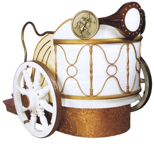 Massive Roman Style "Chariot" ticket booth from the Debbie Reynolds Hollywood Memorabilia Museum in Las Vegas (circa 1992). This custom crafted ticket booth/podium, measuring approximately 7'x6'x6', (Length from front to end of stairs, Width includes two removable 12" wheels, Height is floor to top of front medallion) that was created for the entry to Debbie's Las Vegas "Hollywood Studio Museum", and designed in the Ben-Hur fashion (It strongly resembles Charlton Heston's chariot from the classic film). Solidly constructed of heavy wood with metal tubing and accents, plus wooden-spoked metal -rimmed wheels, and including actual film props sourced from studio sources, this is an amazing statement piece. [Provenance, from the Estate of Debbie Reynolds] Location for shipping zip is postal code 90250.