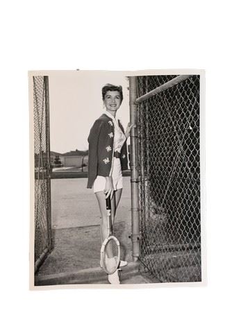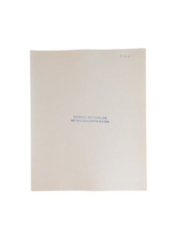 An 8.5" X 11" portrait of Debbie Reynolds posing in a white summer outfit holding a tennis racket at the tennis court. Back of the photo is stamped with Debbie Reynolds name as well as Metro-Goldwyn Mayer. This amazing memorabilia comes direct from the Debbie Reynold's archive collection.
