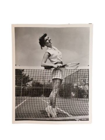 An 8.5" X 11" portrait of Debbie Reynolds posing in a white summer outfit holding a tennis racket at the tennis court. Back of the photo is stamped with Debbie Reynolds name as well as Metro-Goldwyn Mayer. This amazing memorabilia comes direct from the Debbie Reynold's archive collection. This incredible memorabilia comes direct from the Debbie Reynold's archive collection. Debbie Reynolds and Todd Fischer purchased and acquired this amazing collection decades ago from the MGM auction, 20th Century Props auctions, Christie's auctions, Planet Hollywood and numerous additional auctions. Debbie Reynolds then opened Hollywood Central Props where many of these props and costumes were used in the making of feature films and television shows. This auction also marks the beginning of a long-term collaboration with The Debbie Reynolds’ Archives and her son Todd Fisher with a collection of props, costumes and photos including an ensemble from CHOCOLAT, ROMEO AND JULIET, MISSISSIPPI, V FOR VENDETTA, THE PATRIOT, THE LAST SAMURAI and more!