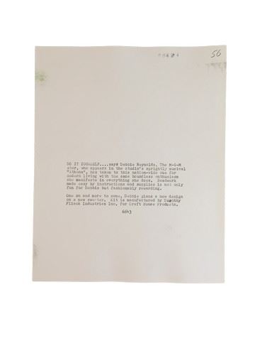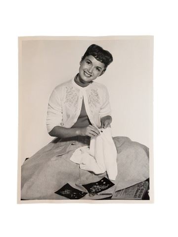 An 8.5" X 11" portrait of Debbie Reynolds sitting down sewing a sweater posing behind a white backdrop. Back of the photo is typed with a description titled "Do It Yourself". This amazing memorabilia comes direct from the Debbie Reynold's archive collection.