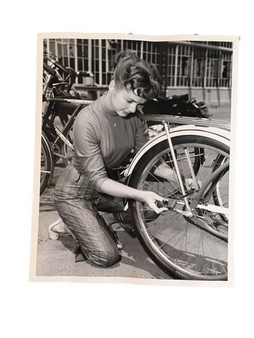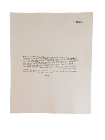 An 8.5" X 11" portrait of Debbie Reynolds posing next to the a bikerack inspecting her bicycle. Back of the photo is typed with a description that writes "Debbie is sure her bike will stay put with an effective lock like this on her wheel". This amazing memorabilia comes direct from the Debbie Reynold's archive collection.