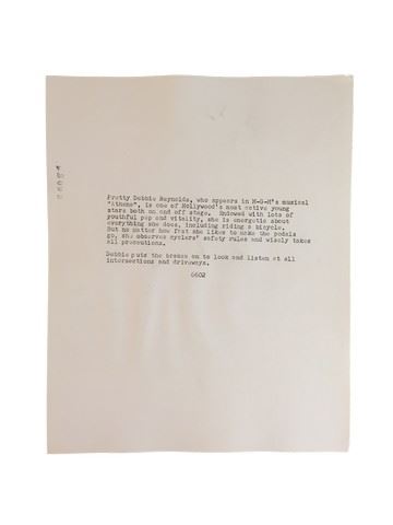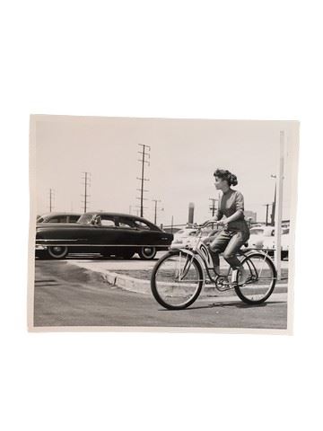 An 11" X 8.5" portrait of Debbie Reynolds riding her bike on the street looking for cars. Back of the photo is typed with a description that writes "Debbie puts the brakes on to look and listen at all intersections and driveways. "This amazing memorabilia comes direct from the Debbie Reynold's archive collection. This incredible memorabilia comes direct from the Debbie Reynold's archive collection. Debbie Reynolds and Todd Fischer purchased and acquired this amazing collection decades ago from the MGM auction, 20th Century Props auctions, Christie's auctions, Planet Hollywood and numerous additional auctions. Debbie Reynolds then opened Hollywood Central Props where many of these props and costumes were used in the making of feature films and television shows. This auction also marks the beginning of a long-term collaboration with The Debbie Reynolds’ Archives and her son Todd Fisher with a collection of props, costumes and photos including an ensemble from CHOCOLAT, ROMEO AND JULIET, MISSISSIPPI, V FOR VENDETTA, THE PATRIOT, THE LAST SAMURAI and more!