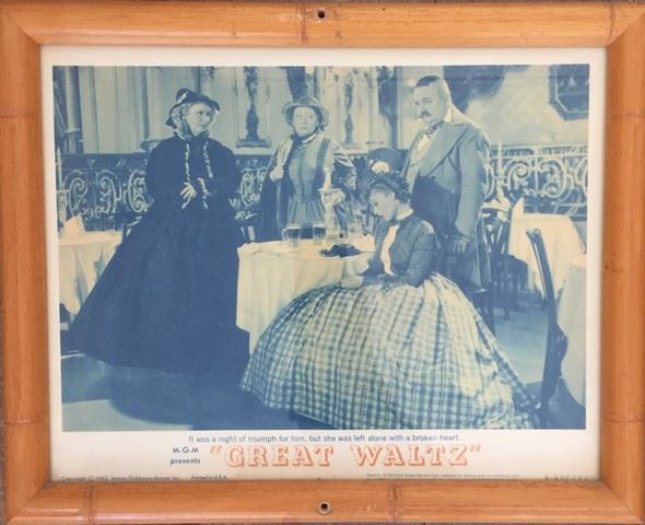 Collection of 2 framed, vintage mini posters from the films Great Waltz (1962) (62/201) and Suspicion (1953) (53/523) as well as 2 framed Broadway Press posters for Camelot (1960) and Kiss Me Kate. The Camelot press card features a personally addressed autograph to Debbie from Robert Goulet and the Kiss Me Kate press card features a personal autograph from Alfred Drake. These frames once hung on the Debbie Reynolds Dance Studio walls (each frame approx. 14"x14 and 12"x15").