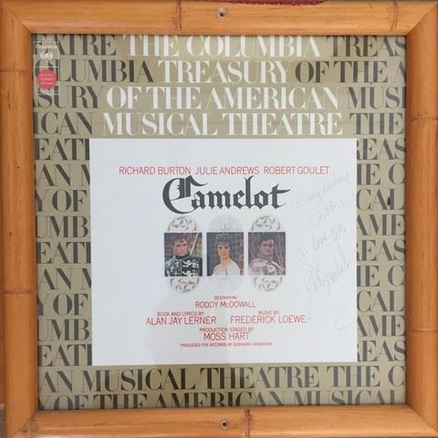 Collection of 2 framed, vintage mini posters from the films Great Waltz (1962) (62/201) and Suspicion (1953) (53/523) as well as 2 framed Broadway Press posters for Camelot (1960) and Kiss Me Kate. The Camelot press card features a personally addressed autograph to Debbie from Robert Goulet and the Kiss Me Kate press card features a personal autograph from Alfred Drake. These frames once hung on the Debbie Reynolds Dance Studio walls (each frame approx. 14"x14 and 12"x15").