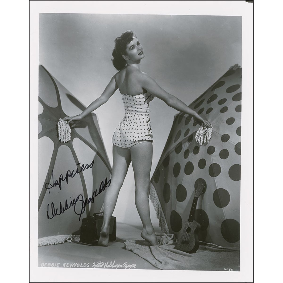 Two different glossy 8 x 10 photos of Reynolds, one alongside her Singin’ in the Rain co-star, Gene Kelly, and one featuring her in a bathing suit between two oversized beach umbrellas, each signed in black felt tip by Reynolds. In very fine condition.