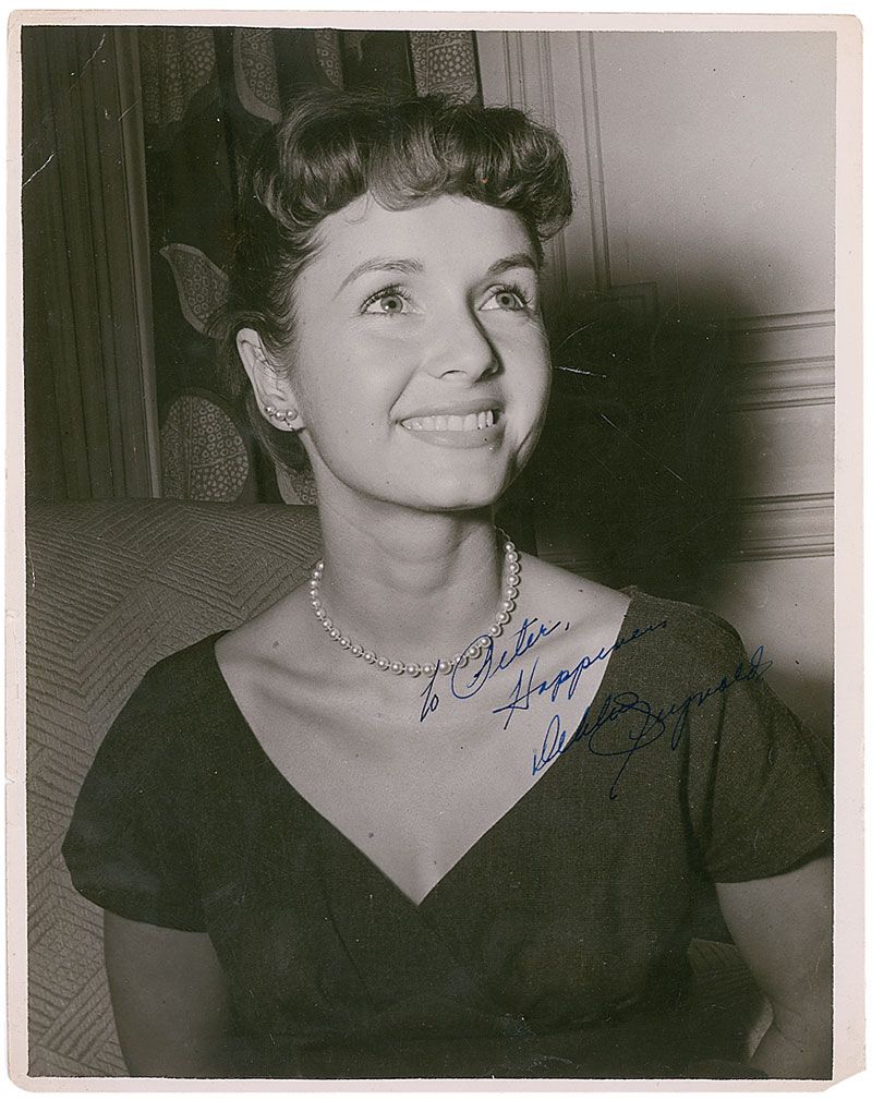 Vintage glossy 8 x 10 photo, signed and inscribed in blue ink “To Peter, Happiness, Debbie Reynolds.” In very good condition, with scattered creases, surface marks, and impressions, some small edge tears, and light curling to vertical edges.