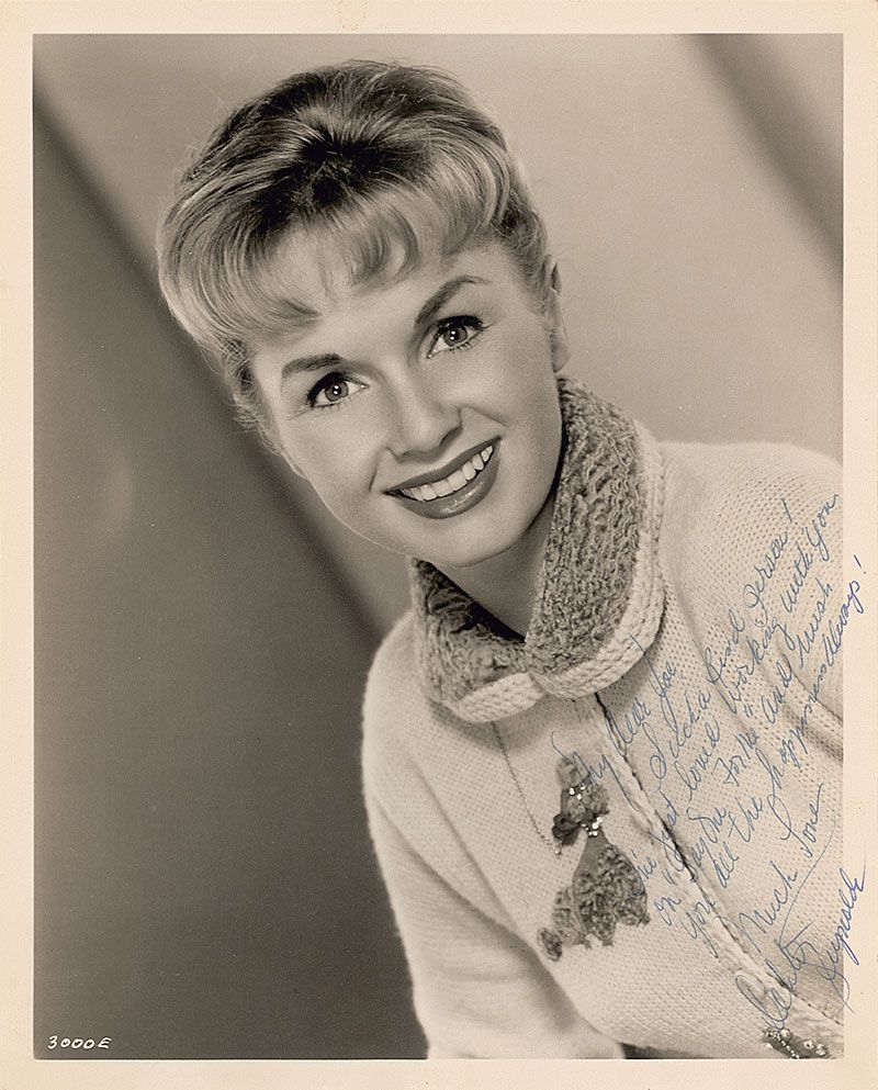Vintage matte-finish 8 x 10 MGM publicity photo, signed and inscribed in blue ballpoint, “My dear Joe, Such a kind person! I’ve just loved working with you on ‘Say One for Me’ and wish you all the happiness always! Much love, Debbie Reynolds.” In fine condition.