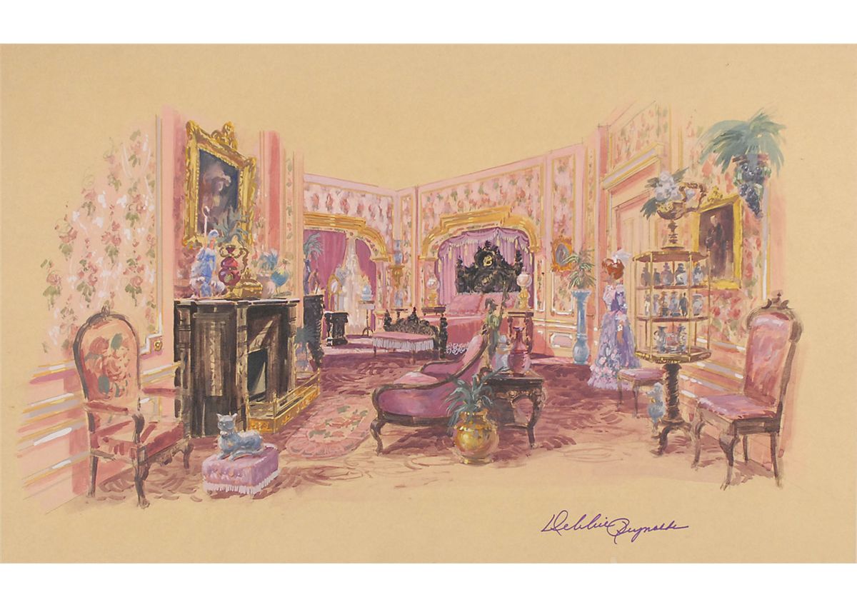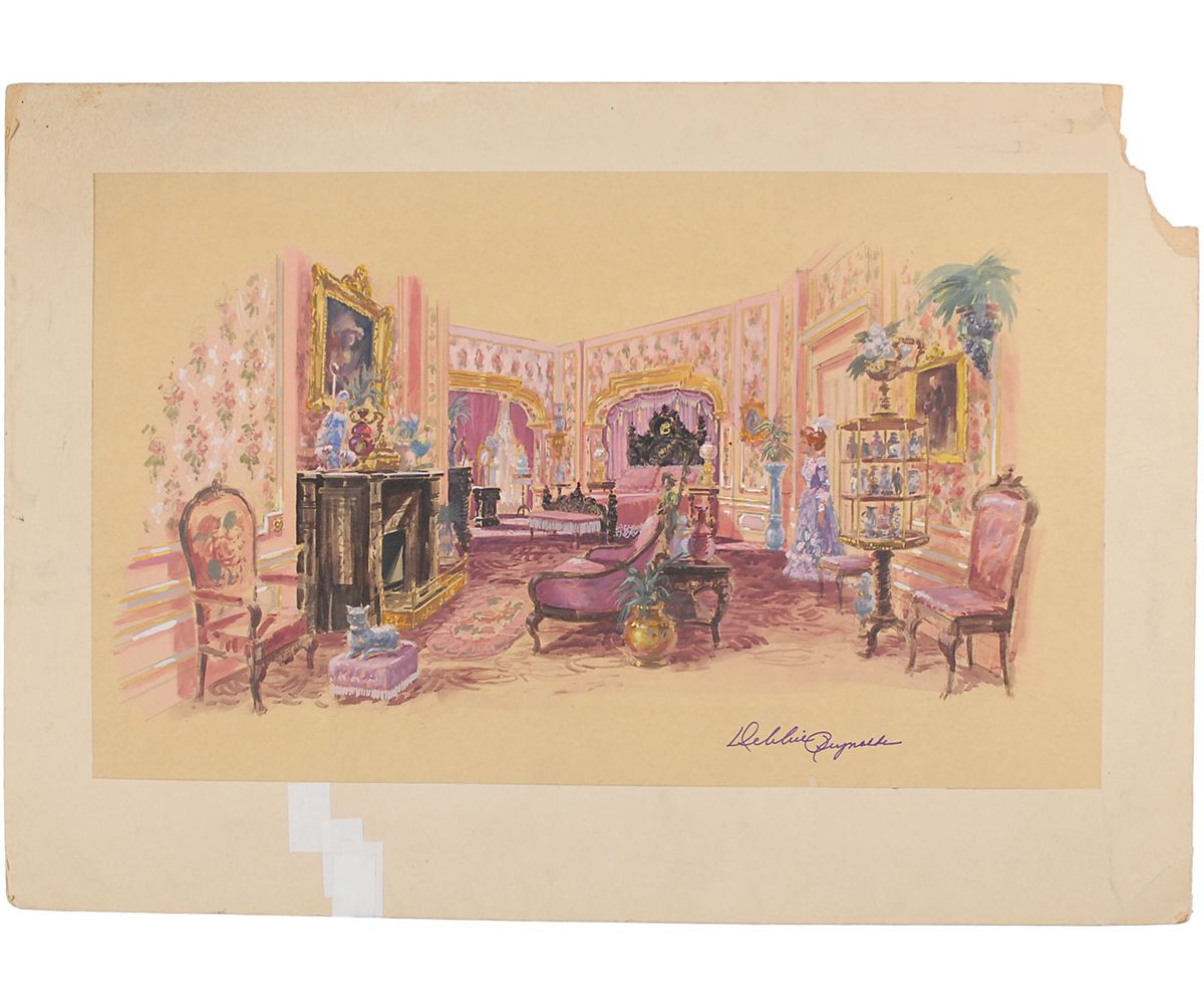 Original concept art of the luxurious bedroom in the 1964 MGM film The Unsinkable Molly Brown, accomplished in gouache and tempera on an off-white 22.5 x 13.5 sheet of illustration paper mounted to an 18.5 x 26.5 board, signed along the bottom in purple felt tip, “Debbie Reynolds.” Paper loss to upper right corner of mount and a repaired crack to the lower left of the mount (artwork unaffected), otherwise fine condition. Originates from the Debbie Reynolds sale held in 2011, and is accompanied by letter of provenance signed by the actress; the artwork was unsigned when initially sold and was subsequently signed by Reynolds. This is a gorgeous piece of concept art, meticulous and lush, showing Reynolds entering her lavishly appointed bedroom as the film’s title character.