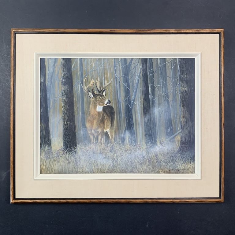 Debi Fitzgerald, Original Framed Deer in the Forest Painting. A deer is always on the alert while hunting for food through the misty forest. Framed in complimentary brown and taupe colors. This piece is in excellent condition.