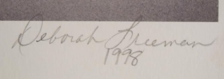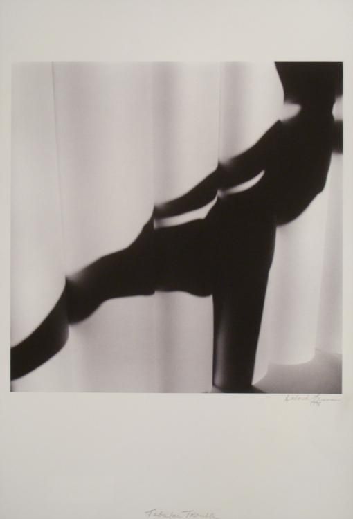 Shadows along a draped curtain reveal the form of a dancer, in this subtly intriguing photo print. * Artist: Deborah Freeman Signature: In pencil, lower right Title: "Tabular Trouble," in pencil, lower centerMedium: Digitally printed photograph on paper Year: 1998, dated under the signature Size: 13 x 19 inches Condition: Excellent