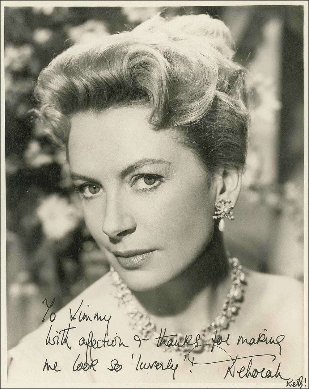 Vintage matte-finish 7.75 x 9.75 head-and-shoulders photo of Kerr donning some impressive jewelry, signed and inscribed in black fountain pen “To Jimmy, with affection & thanks for making me look so ‘luverly’! Deborah Kerr!” Lightly trimmed, otherwise fine condition.