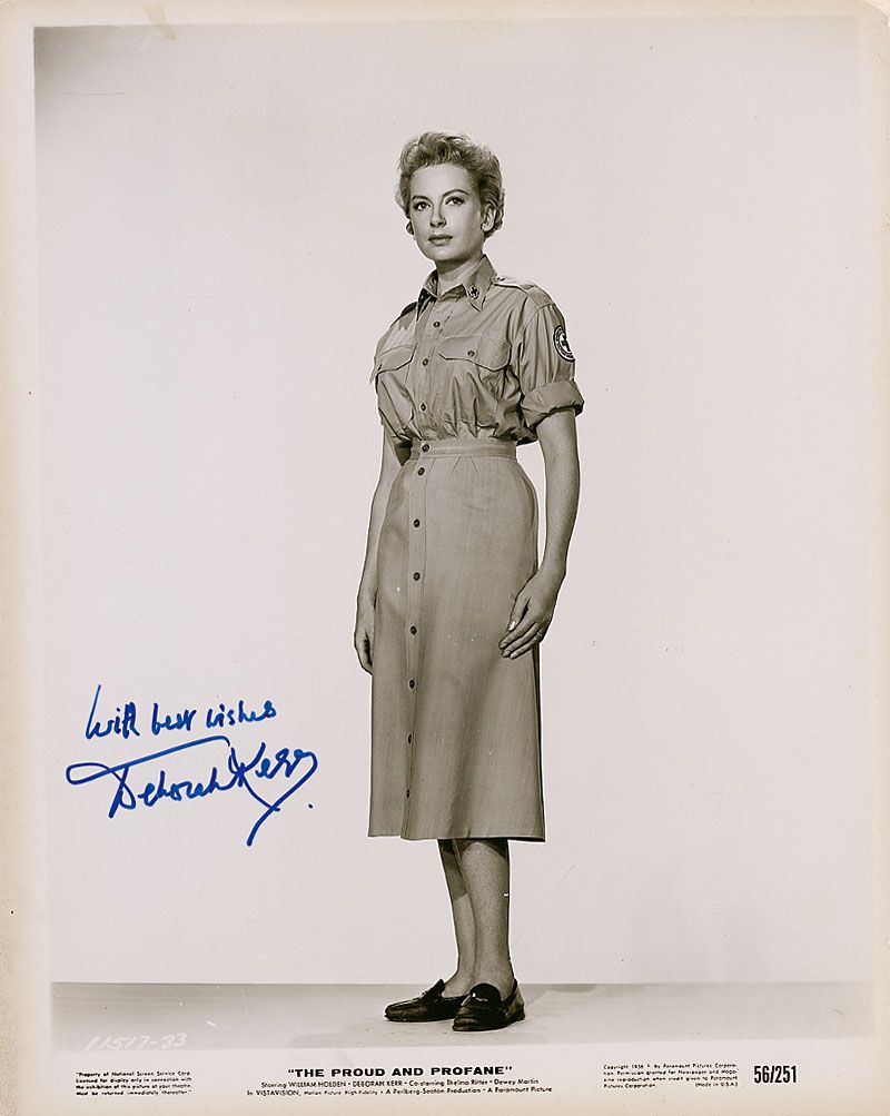 Glossy 8 x 10 Paramount promotional photo for The Proud and Profane, signed in blue felt tip, “With best wishes, Deborah Kerr.” In fine condition, with scattered light creases and surface marks and some light toning to left edge.