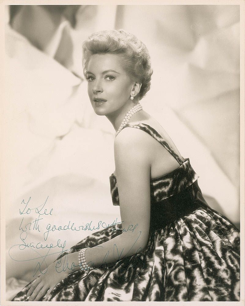 Pretty matte-finish 7.75 x 9.75 photo of Kerr in an elegant dress, signed and inscribed in green ballpoint “To Lee, With good wishes & thanks, Sincerely, Deborah Kerr.” In fine condition, with lightly trimmed edges.