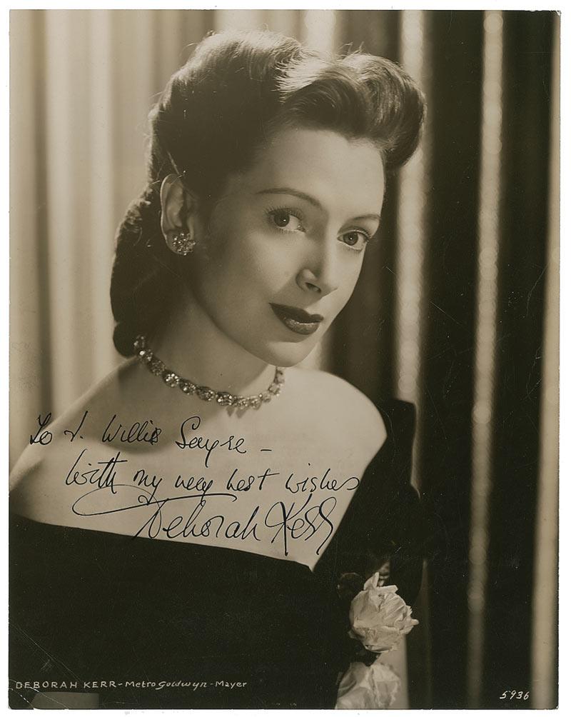 Vintage glossy 7.25 x 9.25 MGM publicity photo, signed and inscribed in fountain pen “To J. Willis Sayre—with my very best wishes, Deborah Kerr.” In very good condition, with scattered creases and surface dings, and trimmed edges.