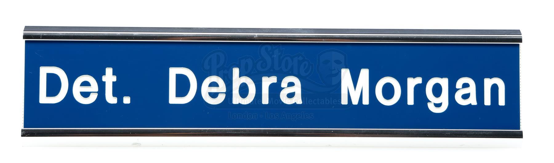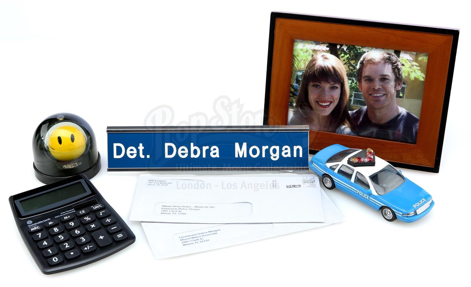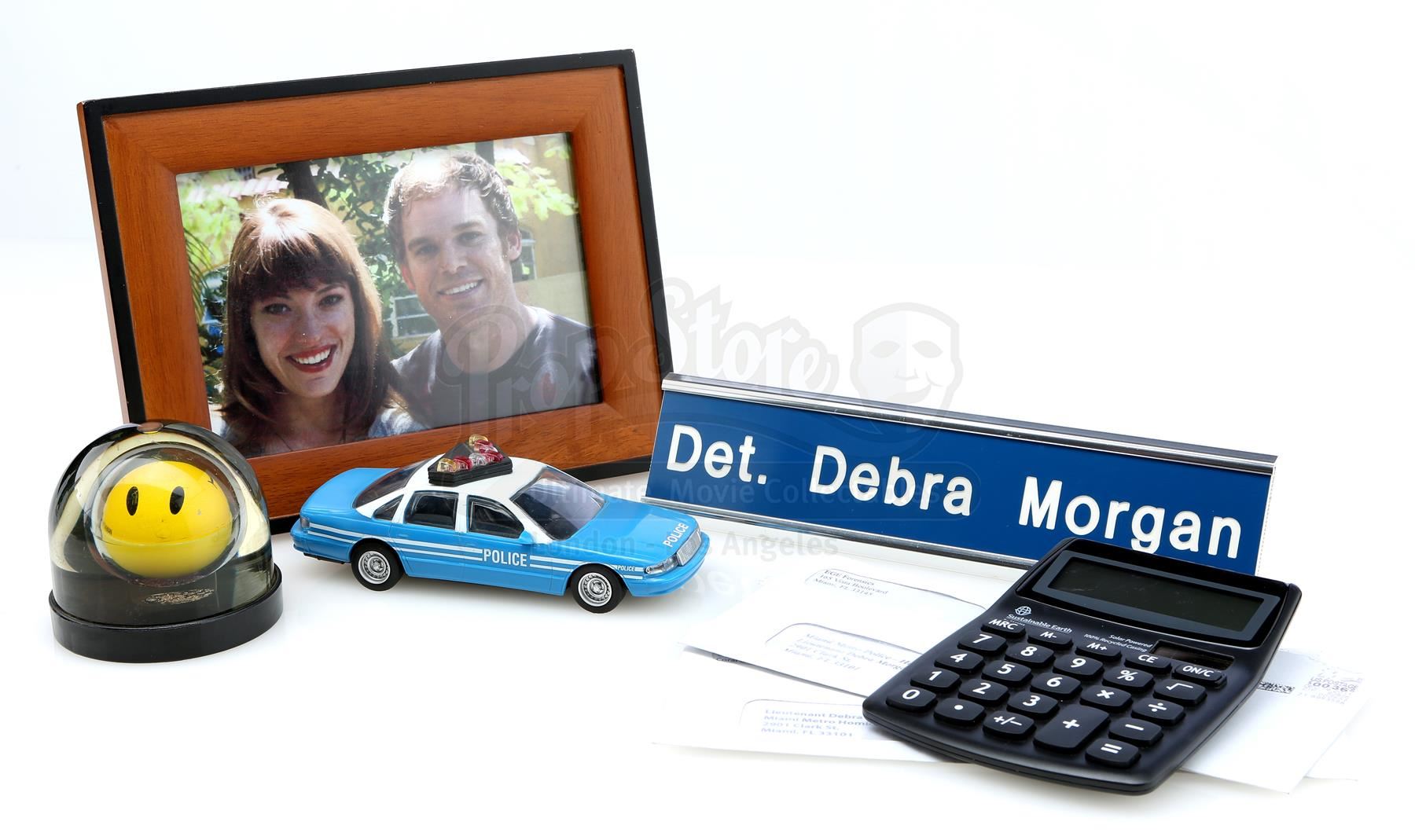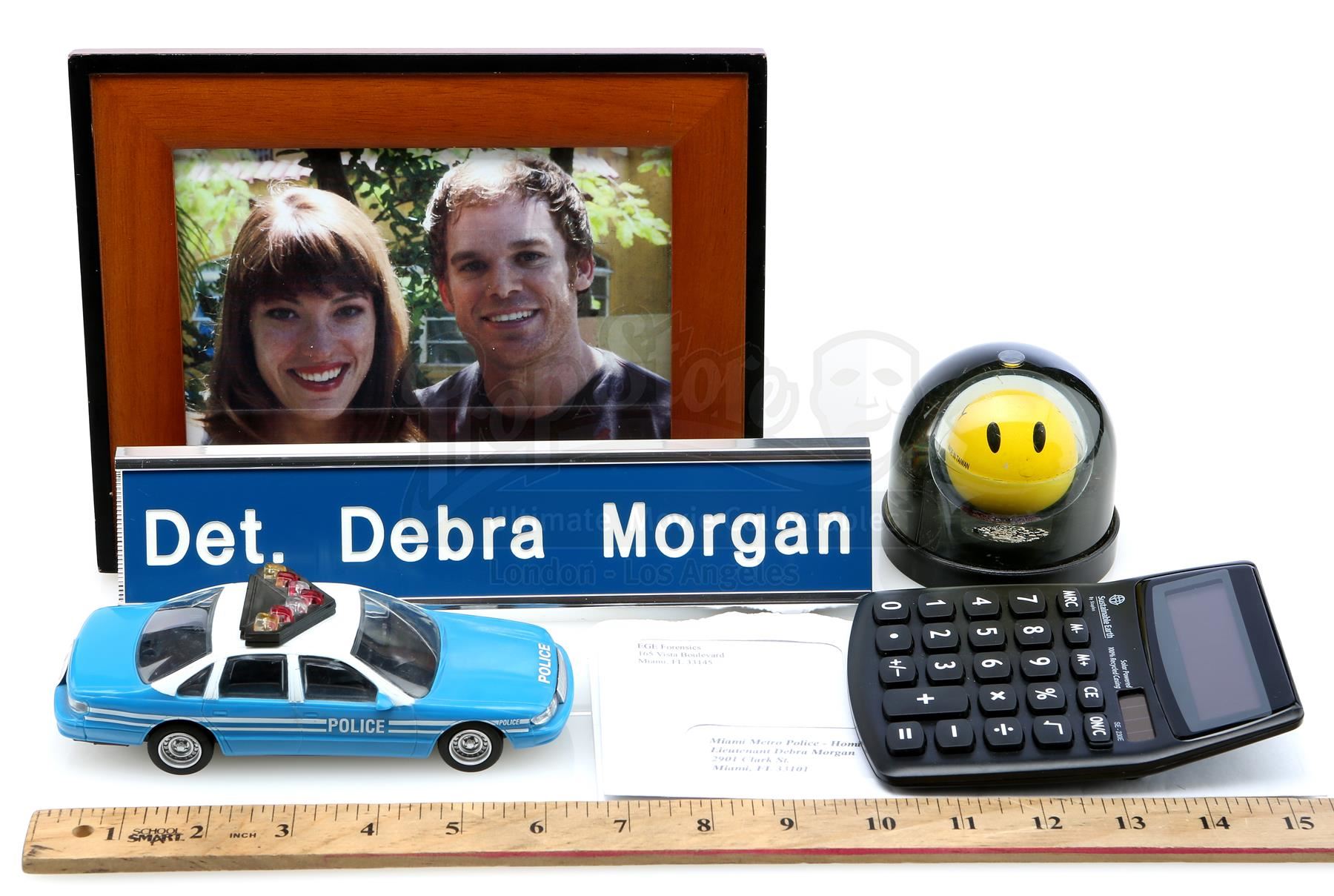 Debra Morgan's (Jennifer Carpenter) desk items from Showtime’s psychological thriller Dexter. The grouping consists of a wood-framed photo of Debra and Dexter (Michael C. Hall) labeled ‘Deb Desk’, two production-opened envelopes addressed to ‘Lieutenant Debra Morgan’, Debra’s aluminum desk sign with blue nameplate, a blue plastic Police car, a yellow happy face snow globe paperweight, and a black plastic calculator labeled ‘Deb desk’. These pieces are in overall very good condition.
