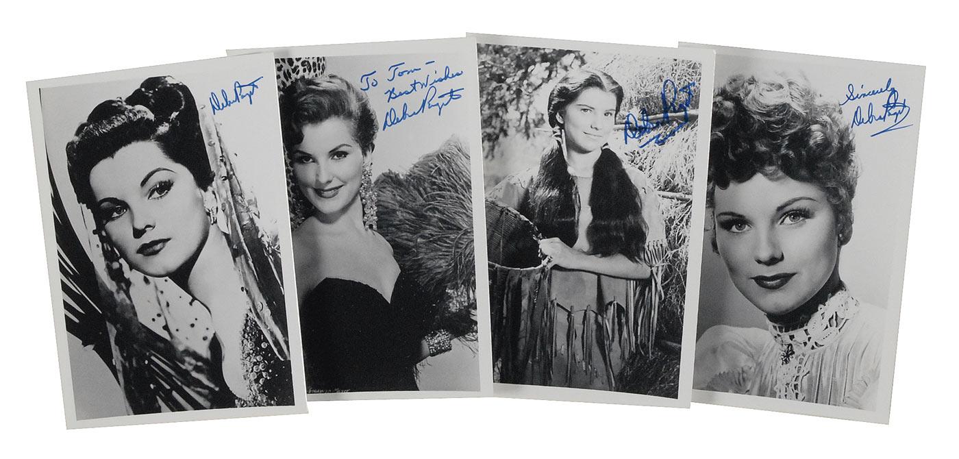 Four different glossy 3.5 x 5 photos of Paget from throughout her career, each signed in blue felt tip, with Paget inscribing one to Tom. In fine condition.
