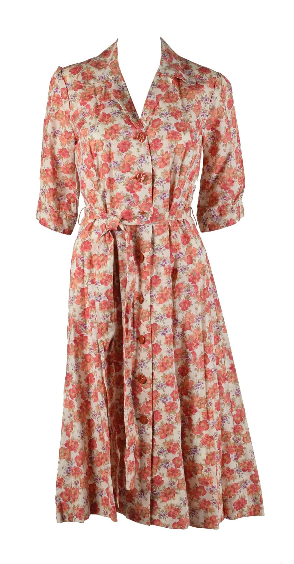 Attractive floral-pattern button-up short-sleeve dress, personally-worn by actress Debra Winger. The red-and-white dress features large dark red buttons on the front and a matching waist sash. Sewn into the collar is a Penny McVitie costumer's label, marked in felt tip, "Debra Winger." In fine condition.