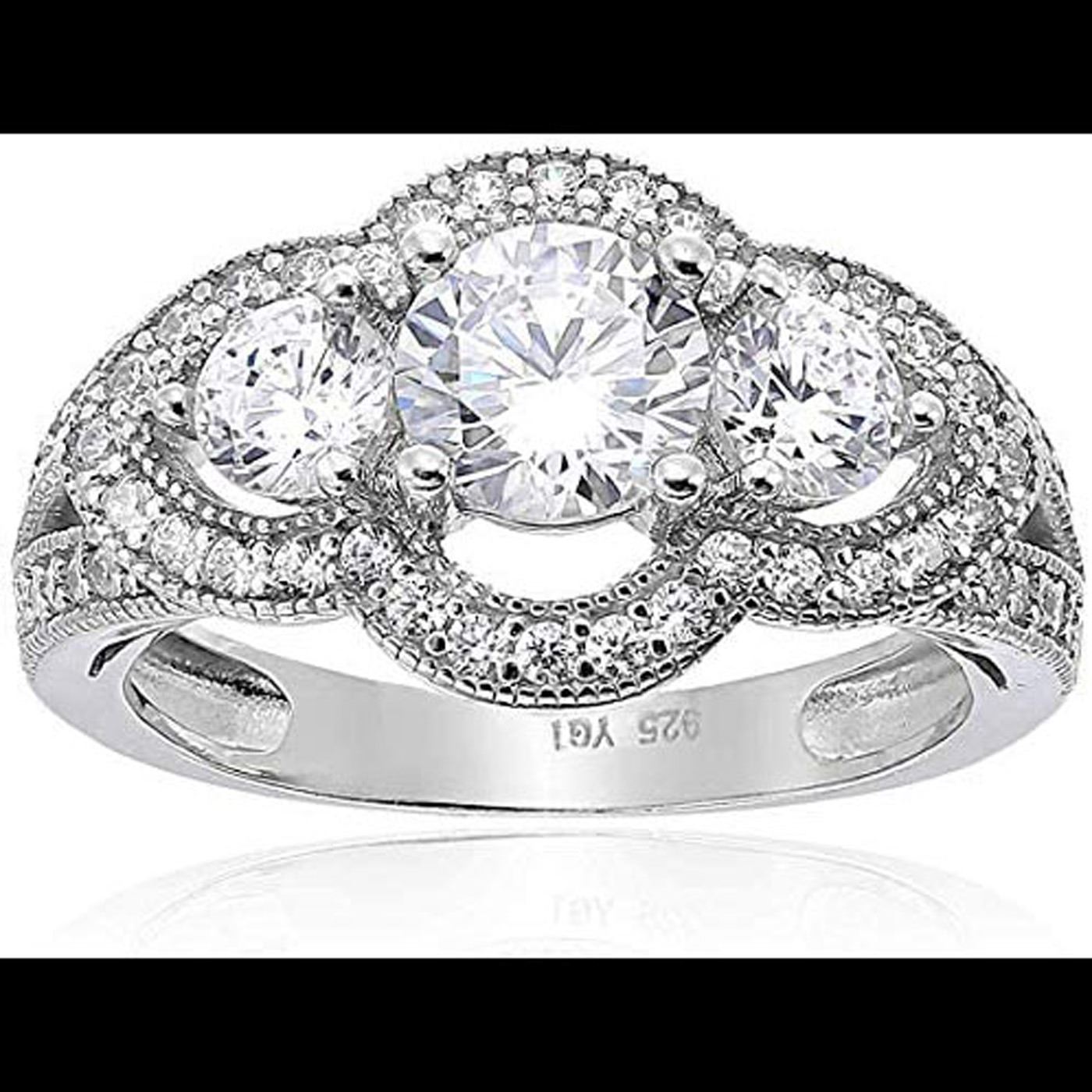 Decadence Sterling Silver 6mm Round 3 Stone Eng Ring with 4mm Round Side Stones Size 9.