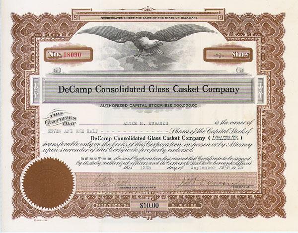1929, Delaware. Stock certificate for 7 1/2 shares. Brown/Black. Spread eagle vignette at top center. Great funeral related item. Uncancelled.