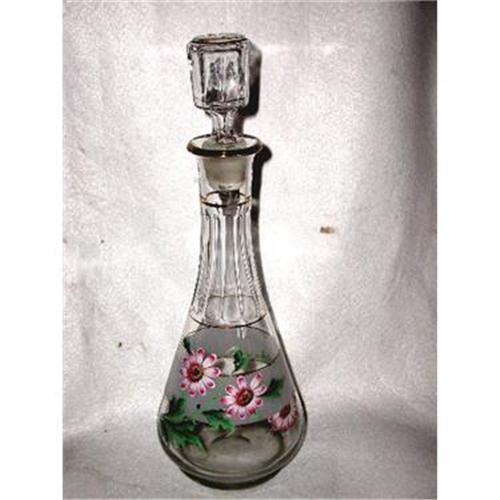 C.1920 glass decanter with gilt trim has a frosted band edged in gold and hand painted with pink daisies and green leaves. In excellent condition with exception to a gold painted daisy on top of stopper shows signs of wear. Stands 13.5H X 5W X 5L. Grooving indention design on stopper and neck.